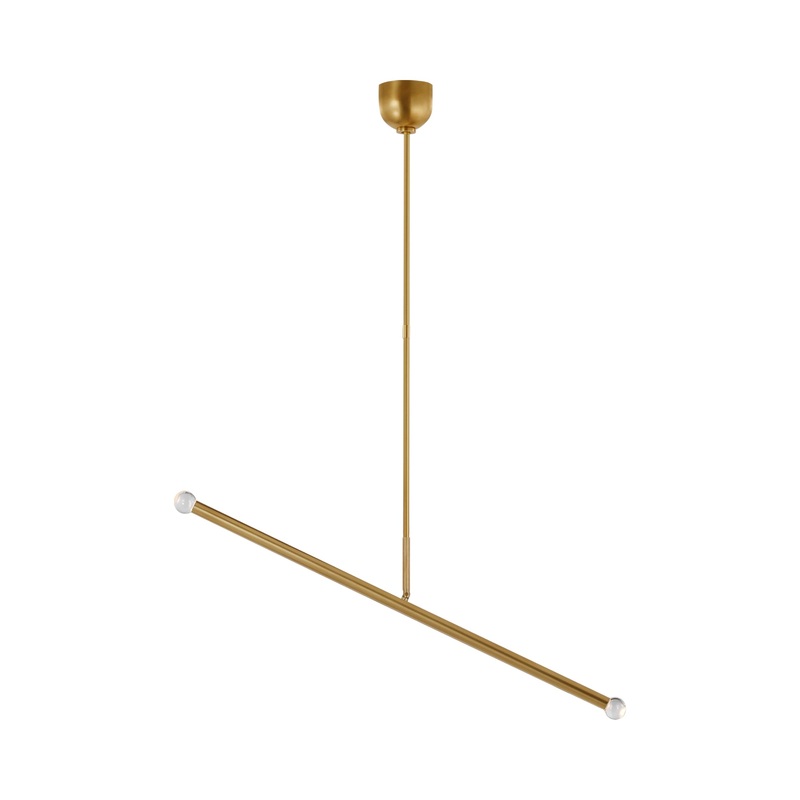 A clever mix of minimalism and geometry ratches up elegance with utilitarian and aesthetic results. Perpendicular silhouetting of a metal frame preserves easy optical benefits as the Rousseau LED Linear Chandelier from Visual Comfort Signature helps balance a strategic interior design scheme. Glass caps punctuate a cylinder body, filtering energy-efficient lighting at both ends in a subtle manner.